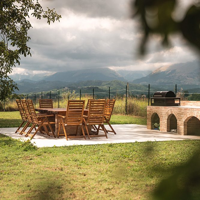 A small vineyard on the south facing terraces was established in 2018, and now produces 200 bottles of wine each year, from Montepulciano, Malvasia Pecorino and Ciliegolo grapes.