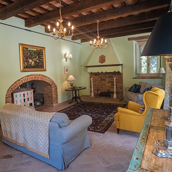 A comfortable sofa and two armchairs gather around the wood burning stove for warm winter evenings. In summer the long arched windows create an elegant environment.